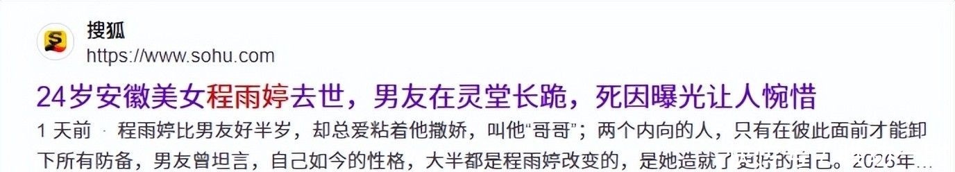 1.搜狐网:24岁安徽美女程雨婷去世,男友在灵堂长跪,死因曝光让人惋惜