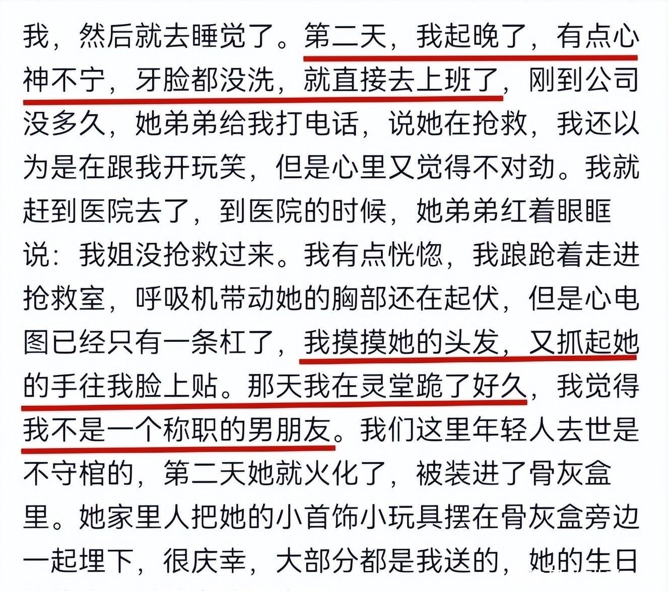 男孩在反复梳理女友生前轨迹后得出结论:长期高压状态叠加心理负荷,才是压垮心脏的最后一根稻草。